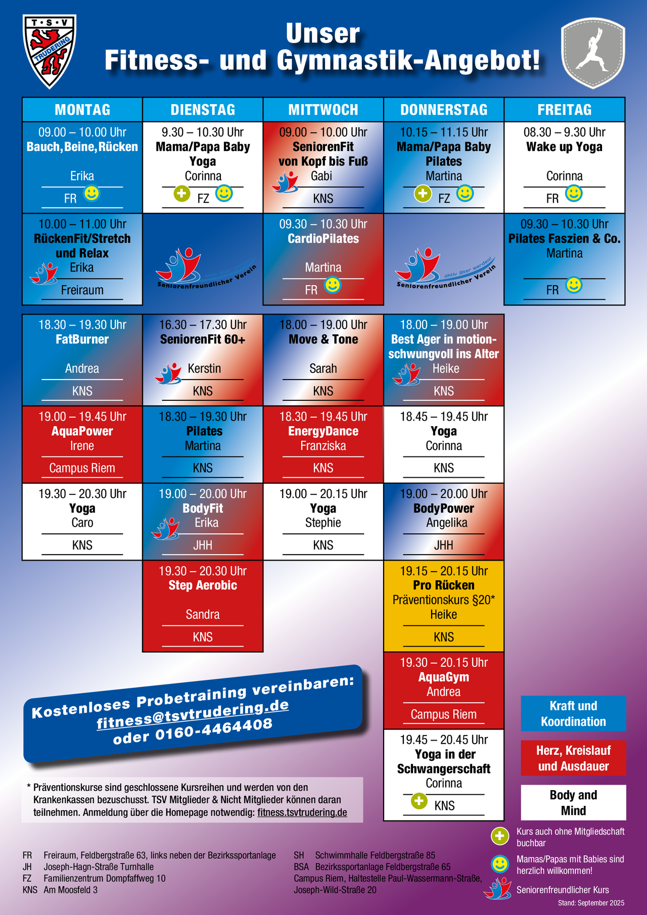 Es haben sich teilweise Trainingszeiten und Kursräume verändert. Der Freiraum ist ab sofort wieder uneingeschränkt nutzbar. Die Aquafitness Kurse werden aus der Feldberghalle zu einem Kurs am Donnerstag im Campus Riem zusammen gefasst, da momentan die Feldberg Schwimmhalle auf Grund von Sanierungsarbeiten gesperrt ist.